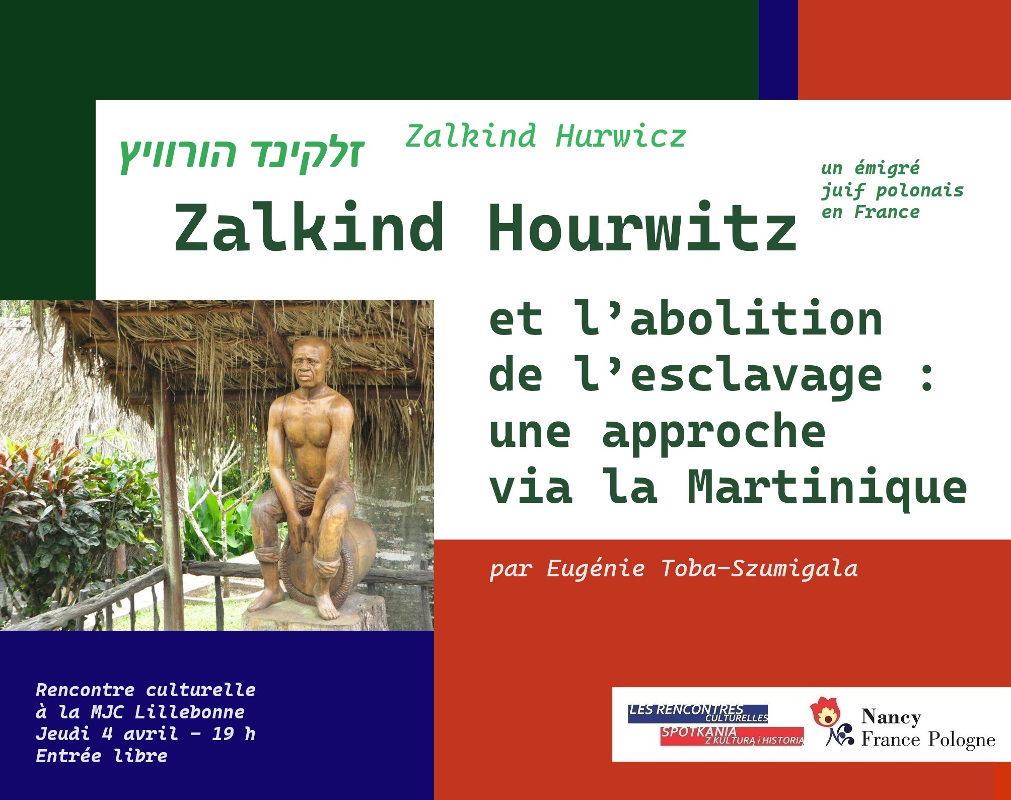 Rencontre culturelle proposée par l’association Nancy France-Pologne. Intervention d’Eugénie Toba-Szumigala, qui évoquera le parcours de Zalkind Hourwitz, émigré juif polonais en France et acteur de la Révolution française, et notamment sa contribution à l’abolition de l’esclavage. Entrée libre.